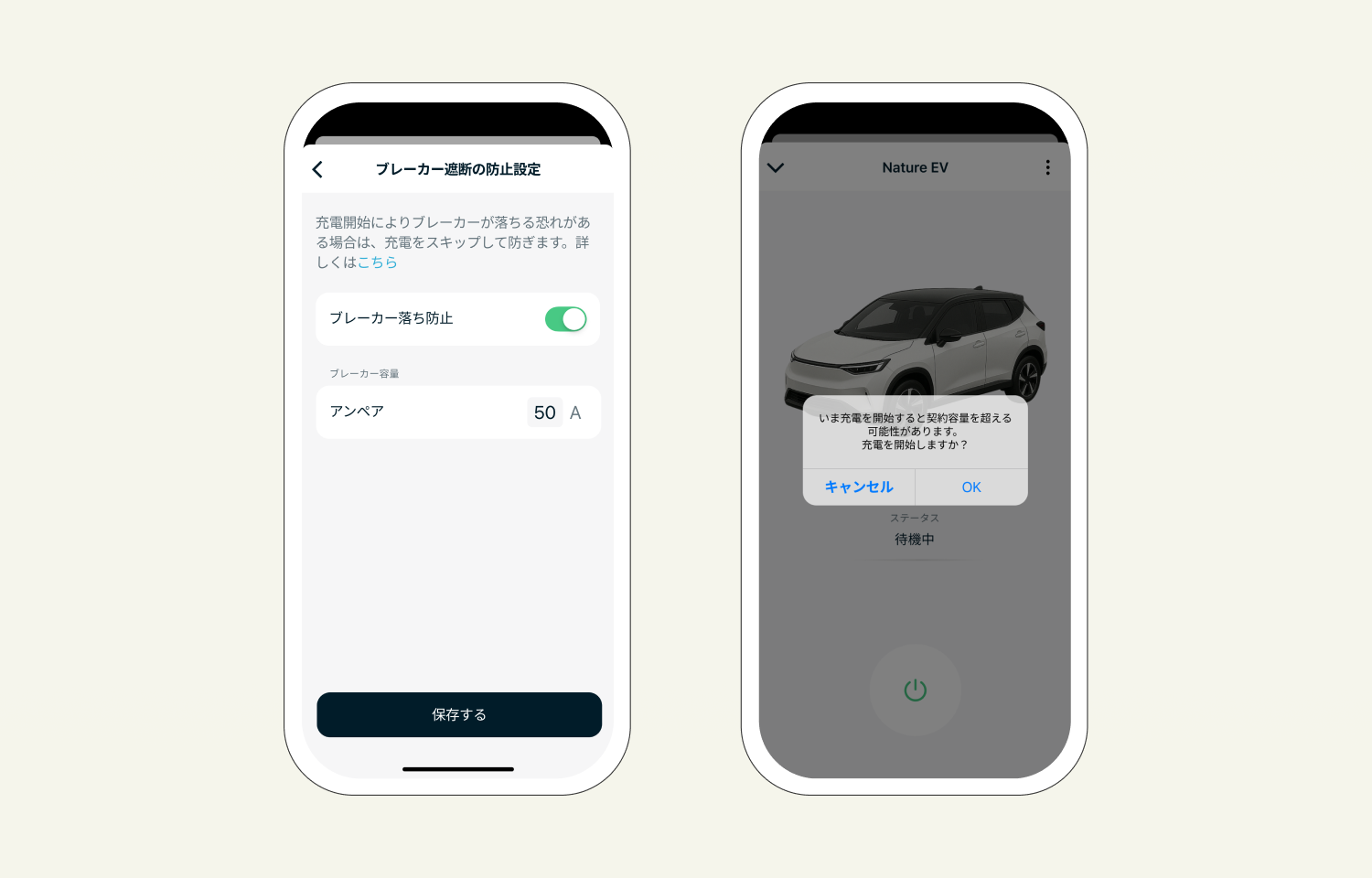 ブレーカー落ち防止機能:契約容量を超える前に自動的に充電を制御し、安全な環境を維持。