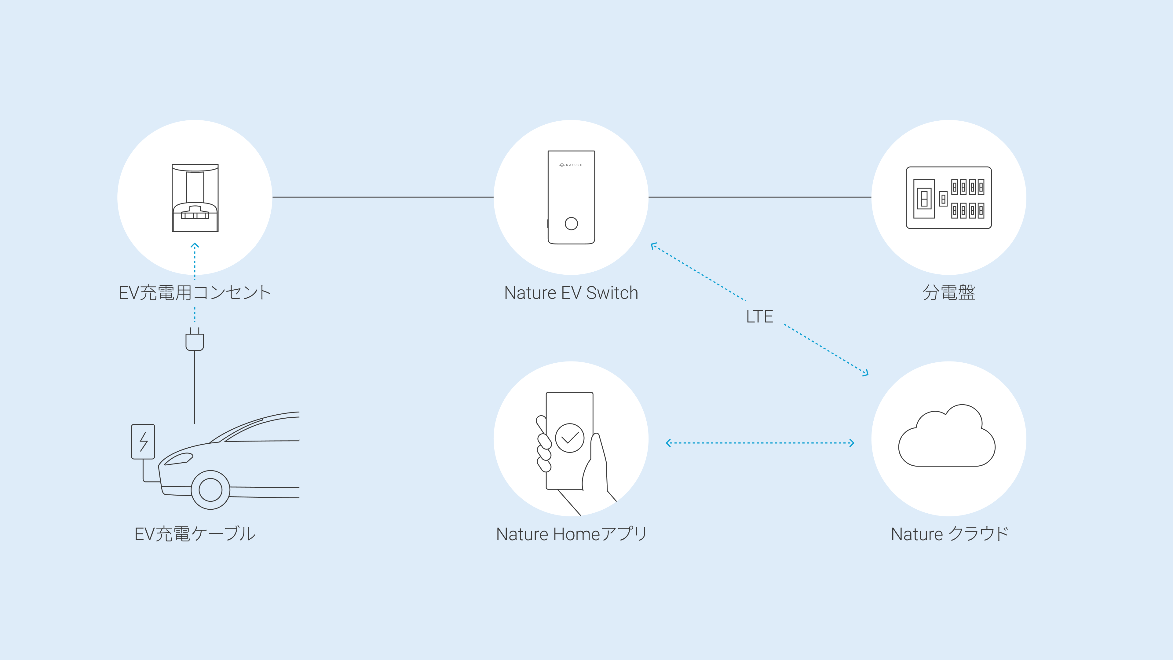 Nature EV Switchは、家庭のEV充電コンセントに接続し、LTE通信を通じてクラウドと連携するスマートEV充電コントローラーです。